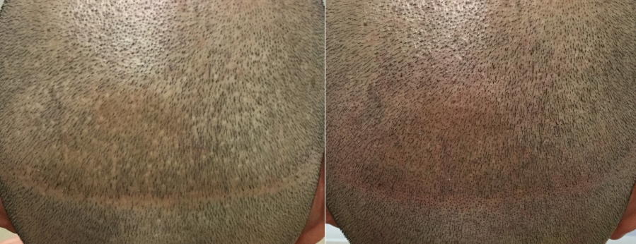 또 대량이식을 하시고 민머리 스타일의 짧은 머리 스타일을 원하시는 분들 역시 위 사진처럼 흉터가 눈에 띌 수 있습니다. 비절개 모발이식이 흉터가 없는 수술로 이해하셨던 분들은 당혹스러우실 수 있습니다.
