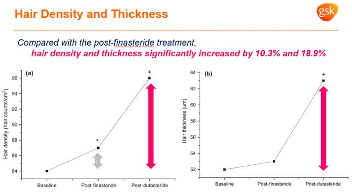 - 두타스테리드를 6개월간 복용시 피나스테리드 1mg 복용에 비해 모발밀도는 10.3%, 모발두께는 18.9%까지 유의하게 증가하였음.