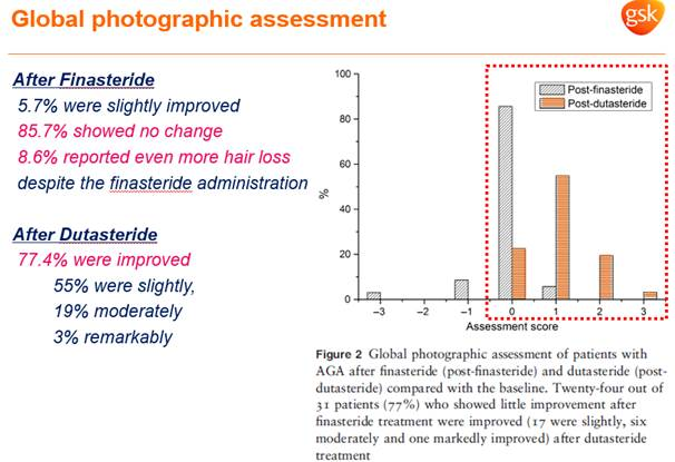 - 피나스테리드 1mg 을 복용한 환자에서 두타스테리드로 전환 후 6개월 동안 복용시 77.4%의 환자가 호전을 보였음.
