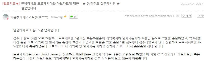 피나스테리드(프로페시아) 약물을 드신 후 기억력 저하, 우울감, 인지기능 저하가 느껴지시는 분이 두타스테리드(아보다트)로 약을 바꾸면 어떨지 질문을 주셨습니다.