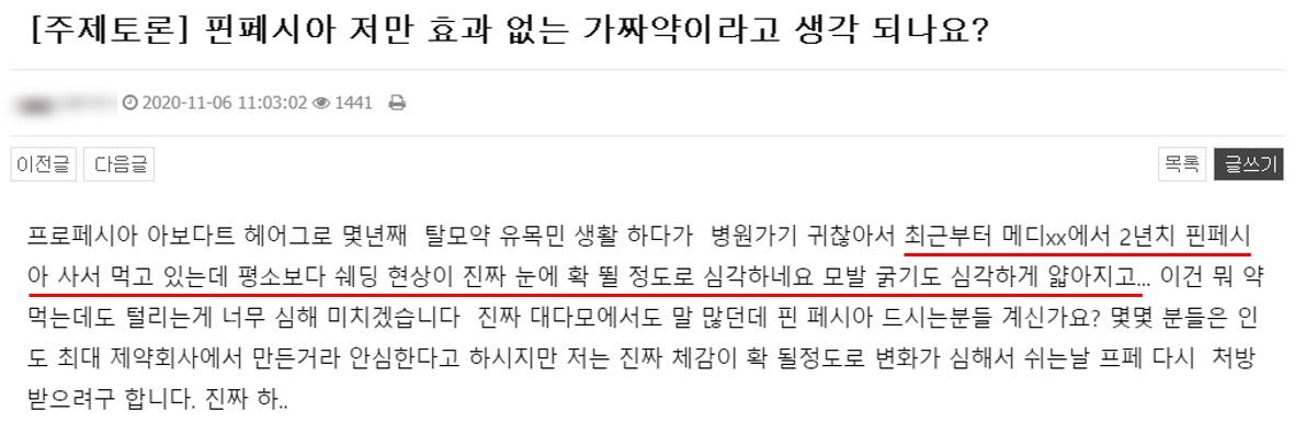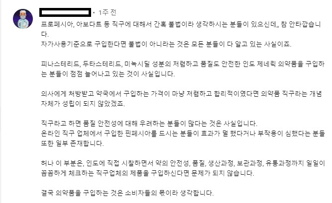 법적인 부분 외에 의학적인 부분도 문제가 있습니다. (의료인으로서 법적인 문제보다는 부작용 부분이 더 마음이 쓰입니다.) 국내에서 출시되는 약들은 식약청이 품질 및 약효, 안전성을 확인해서 승인하는 반면에 해외 직구는 이런 부분이 확인이 어렵습니다. 국내에서 아직 검증받지 않은 상태의 제품이며, 무엇보다 유통 과정이 불법이므로 인도 회사의 정품인지 확인이 어렵습니다. 문제가 생겼을 때도 책임질 수 있는 주체가 없습니다. 과정이 불법이기 때문입니다. 실제로 해외직구 약을 드시는 분들이 일부 효과를 덜 보거나 부작용이 심하다는 분들이 꽤 있습니다.