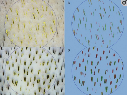위 사진은 보면 현미경으로 모발을 확대해서 본 것입니다. 위쪽의 두장의 사진보다 아래쪽 두장의 사진이 머리카락 두께가 두껍습니다. 아무래도 이런 모발을 가지고 계신 분은 좀 더 좋은 결과를 기대할 수 있습니다.