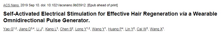 ACS Nano. 2019 Sep 10. doi: 10.1021/acsnano.9b03912. [Epub ahead of print] Self-Activated Electrical Stimulation for Effective Hair Regeneration via a Wearable Omnidirectional Pulse Generator. Yao G1,2, Jiang D3,4, Li J1, Kang L3, Chen S2, Long Y1,2, Wang