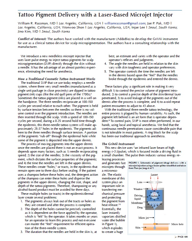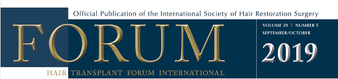 세계모발이식학회(ISHRS; International Society of Hair Resoration Surgery)의 학회지 2019년 9-10월호에 저희 의료진이 최초로 무바늘 두피문신에 대해서 논문을 발표하였습니다.