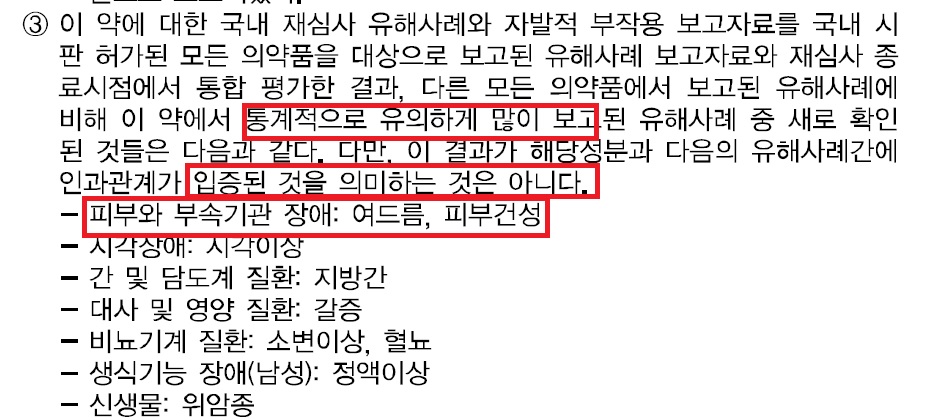 "다른 모든 의약품에서 보고된 유해사례에 비해 이 약에서 통계적으로 유의하게 많이 보고된 유해사례 중 새로 확인된 것들은 다음과 같다. 다만, 이 결과가 해당성분과 다음의 유해사례간에 인과관계가 입증된 것을 의미하는 것은 아니다."