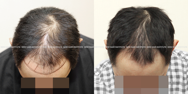 탈모치료를 약 1년 6개월 간 하신 분의 전후 사진입니다. 정수리 부분에 모발이 굵어지고 새로 많이 나서 탈모 영역이 줄어들었습니다. 이번에 모발이식을 하실 일정을 잡았습니다.