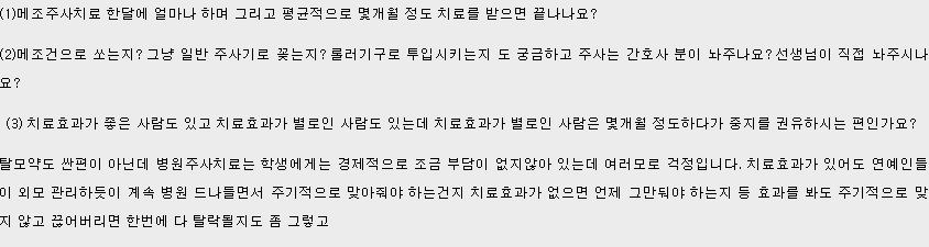 이 모낭주사가 정말 탈모치료에 효과가 있는지에 대해서 궁금해하시는 분들이 많아요. 치료효과를 보지 못하는 분은 극히 드뭅니다. 효과가 낮다고 하는 경우에도 치료를 하지 않은 것보다는 낫기 때문에 중지를 권하는 경우는 거의 없습니다. 치료를 중단하면 효과를 본 부분이 시간이 지나면서 서서히 사라지게 됩니다.