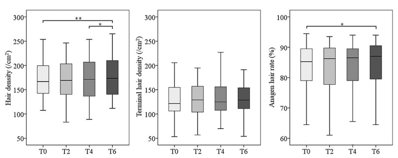 치료 시작 시점부터 2주마다 모발 밀도, 경모 밀도, 생장기 모발 비율을 비교했습니다. 치료 기간이 누적되면서 효과가 계속해서 증가하는 모습을 확인할 수 있습니다. 남 녀 모두에서 비슷한 양상을 보였고 피나스테리드를 복용 중이든 아니든 마찬가지였습니다.