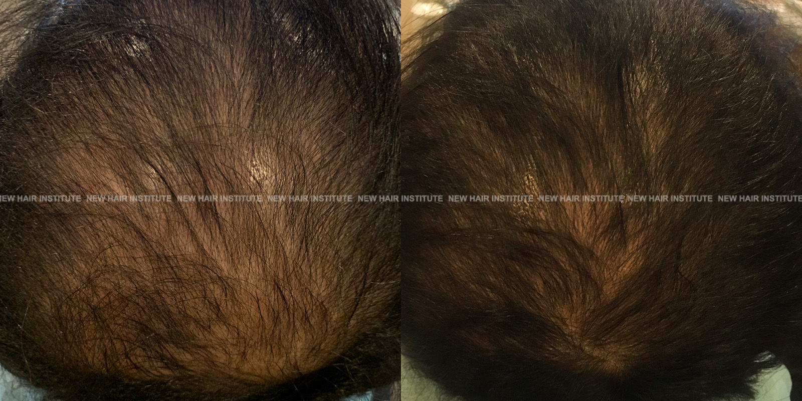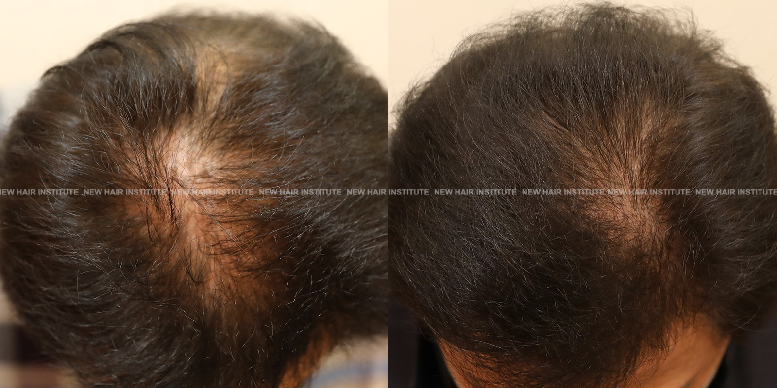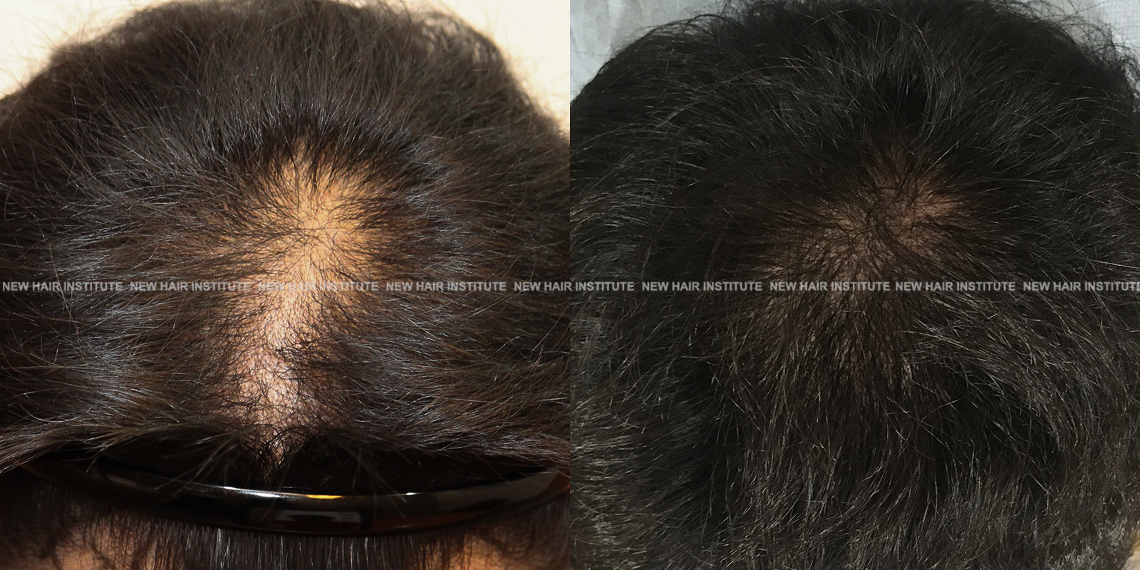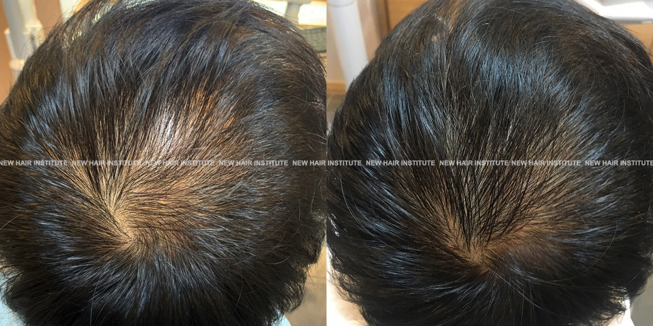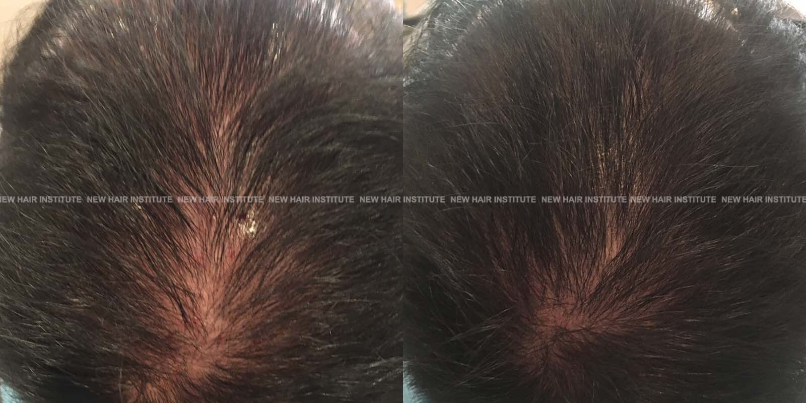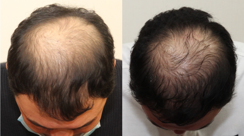 특히 좋은 효과를 보인 33세 남성의 경우 치료 기간을 1년까지 연장했는데, 치료 시작 시점에서 Norwood 분류 6단계에 해당하던 상태가 크게 호전되어 헤어라인과 두정부 모두 상당한 모발이 자라난 것을 확인할 수 있습니다.