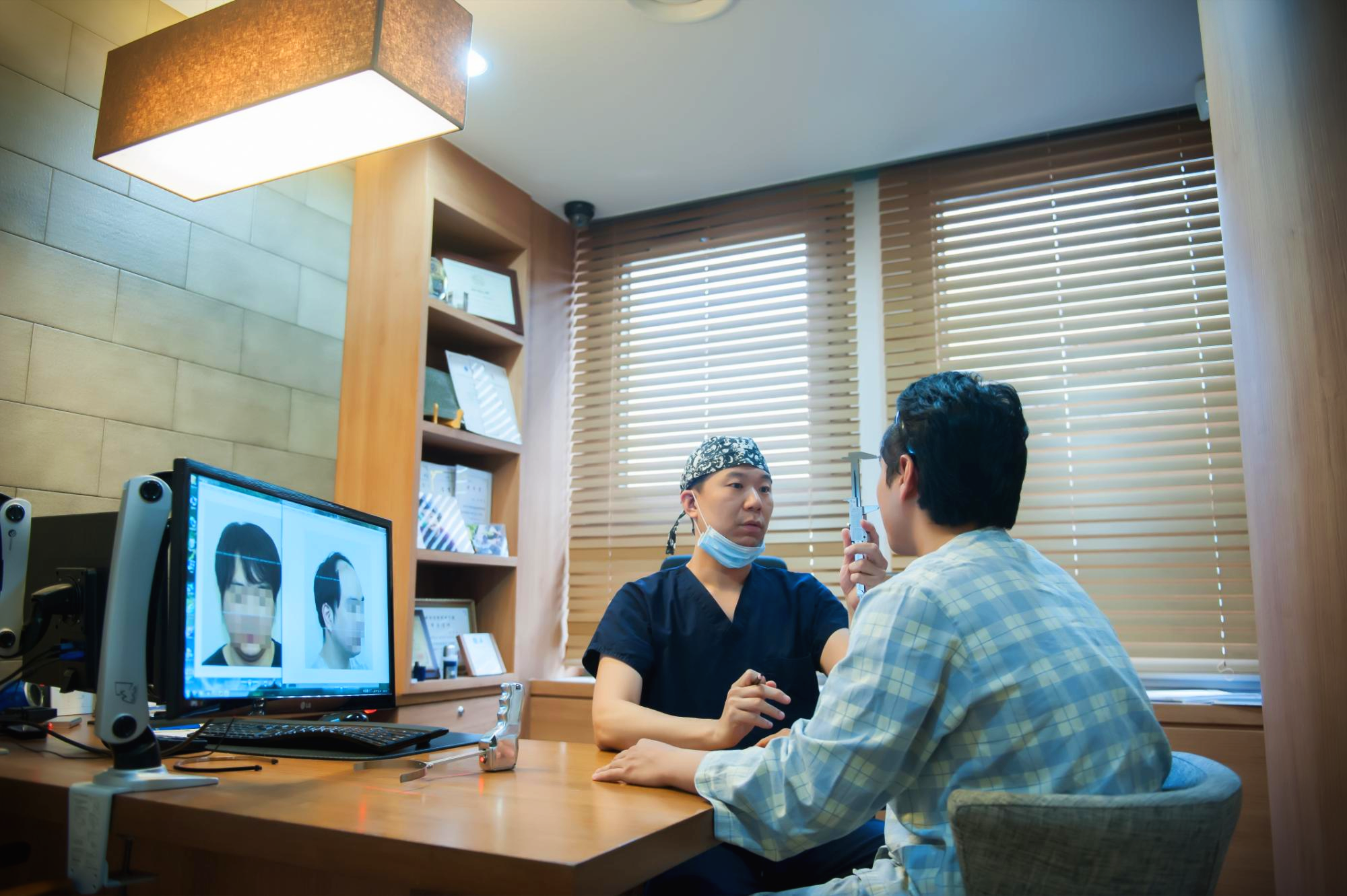 1. 현재 상태: 탈모 증상 여부, 헤어라인의 모양 확인, 모발 견인 검사 등