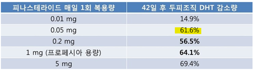 그렇다면 부작용이 우려되는 분들은 굳이 1mg을 먹지 않고 0.05mg 정도만 복용해도 1mg 못지않은 효과를 볼 수 있지 않을까 하는 궁금증이 드실 수 있습니다. 하지만 이 수치는 참가자 숫자가 적어서 생긴 오차로 보는 해석이 많습니다.
