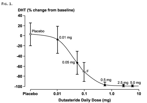 2004년에 발표된 연구로 두타스테리드의 전립선비대증의 치료 효과를 확인하기 위해 진행된 연구입니다. 내용 가운데 두타스테리드 농도에 따른 DHT 차단율에 대한 그래프를 살펴보겠습니다. 용량이 증가하면 차단율도 상승하며 0.5mg 이후로는 그 폭이 크게 줄어든다는 사실을 알 수 있습니다
