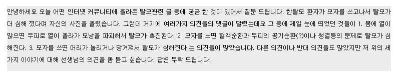 결론부터 말하자면 의학에서는 '두피열'을 탈모의 원인으로 보고 있지 않습니다. 아직까지 두피열이 원인이 되어 탈모가 되었다는 보고나 연구는 없습니다.