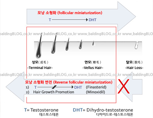 머리카락은 모낭이라는 조직에서 생산이 되어 자라는데, 이 모낭이 생존하기 위해서는 혈관이 필요합니다. 그래서 혈류가 좋지 않아 모낭이 소멸되고 머리카락이 더 이상 자라지 않는다는 속설이 그럴듯하게 들리는 것 같습니다. 모낭은 혈류가 좋지 않아 사라져 탈모가 되는 것이 아니라 모낭이 DHT에 의해 공격받아 점차 소형화되다가 결국엔 소멸되기 때문에 사라진 모낭에 연결되어 있던 혈관도 사라지는 것입니다.