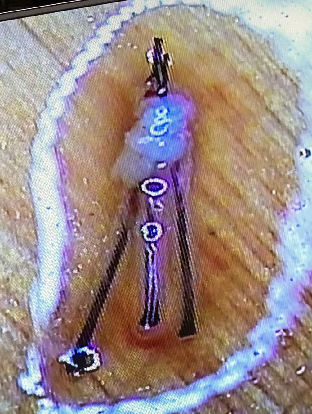 비절개 채취 시 사용하는 펀치의 직경은 0.8~1.1mm 정도로 다양합니다. 이 모낭은 곱슬이 심하다는 점을 감안하여 비교적 큰 1mm 펀치를 사용하여 채취하였지만 그럼에도 불구하고 좌측의 모낭이 손상을 피하기는 쉽지 않습니다.