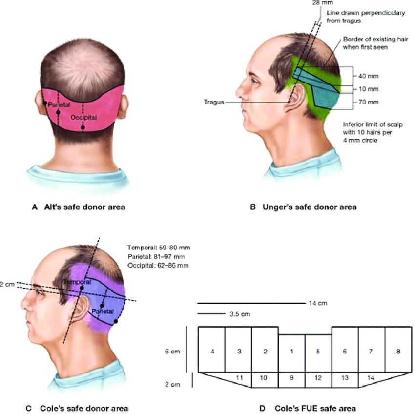 탈모가 진행되더라도 모발이 완전히 탈락하지 않을 것으로 예상되는, 그래서 모발이식의 채취 부위로 적합한 부위를 안전영역(Safe Donor Area, SDA)라고 합니다. 위의 사진은 의사들이 유용하게 사용하는 몇 가지 지침입니다. 사람마다 머리 크기나 탈모 진행 패턴이 차이가 나기 때문에 이런 지침을 기계적으로 적용하지 않고 매 환자분들에게 맞춰 조금씩 수정하여 채취합니다.