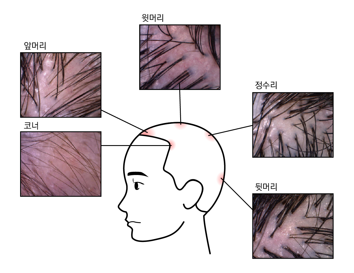 일반적인 형태의 남성형 탈모라면 M자 부위와 정수리 가마 부위의 연모화율이 다른 부위에 비해 높을 것입니다. 반대로 DPA나 DUPA 등의 확산성 탈모는 더 넓은 부위, 경우에 따라서는 후두부에도 그 비율이 20%를 넘어섭니다.
