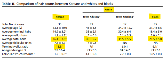 한국인의 평균 모발 갯수가개수가 16.1개로 35~40개가 나온 백인에 비해 절반도 안되며 흑인에 비해서도 적다는 결론입니다. 반면 성모 대 연모 비율은 한국인이 더 좋은 모습을 보였는데 이는 머리카락의 개수가 적은 대신 굵기가 비교적 더 나은 동양인의 모발 특성에서 비롯된 결과로 예측됩니다. 다만 참여자가 적어 결과가 왜곡되어있을 가능성이 있기 때문에 동양인을 대상으로 한 다른 연구도 소개해드리겠습니다.