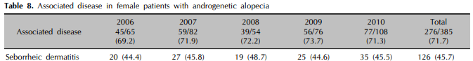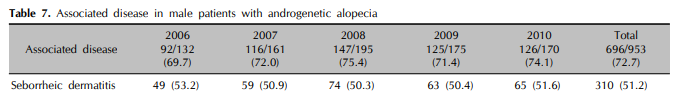 내원한 환자 가운데 남성은 약 50% 내외, 여성은 45% 정도로 지루성 두피염 증상을 보였습니다. 이 수치는 탈모가 없는 사람들에 비해서는 1~3% 정도 높은 수치였지만 통계적으로 유의할 정도는 아니었습니다.