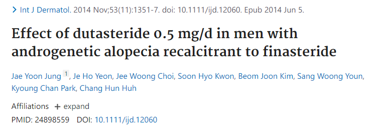 2014년 분당서울대병원 허창훈 교수님이 발표한 연구입니다. 피나스테리드를 6개월 이상 사용했지만 큰 효과를 보지 못한 유전성 탈모 환자 35명에게 6개월 간 두타스테리드 0.5mg을 복용하게 하고 효과를 관찰했습니다.