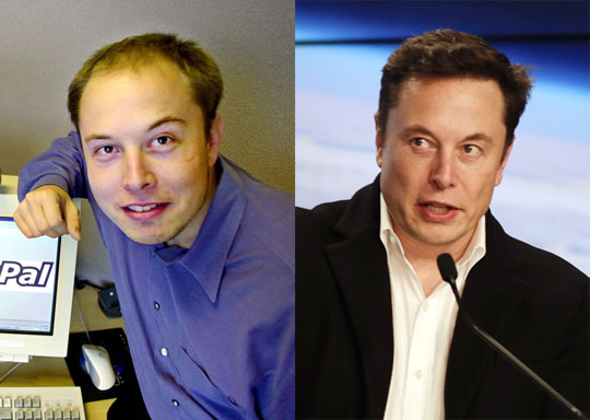 테슬라의 CEO로 유명한 일론 머스크의 모발이식 전후 사진입니다. 모발이식 후의 이미지가 훨씬 카리스마 있어 보입니다. 탈모일 때가 훨씬 젊은 시기였을텐데 모발이식 후 머리숱이 늘어나니 더 젋어보이구요. 정치인들이 선거 때마다 머리숱 많아 보이게 하려는 데는 이유가 있습니다.
