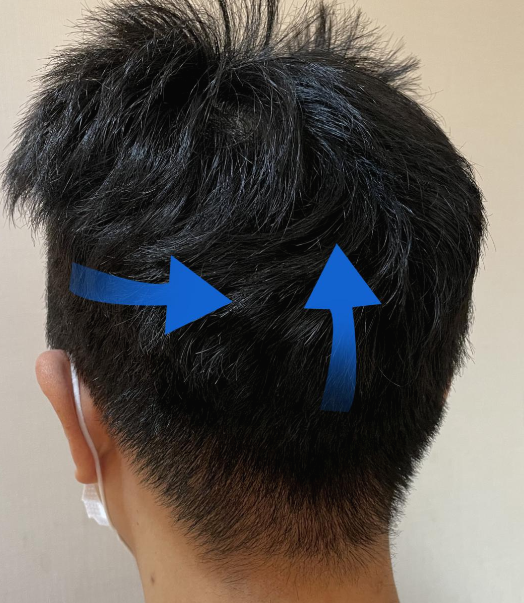 위 사진에서 보시면 파란색 화살표 방향으로 갈수록 모발의 깊이가 깊어지는 경향을 보이는 것입니다.