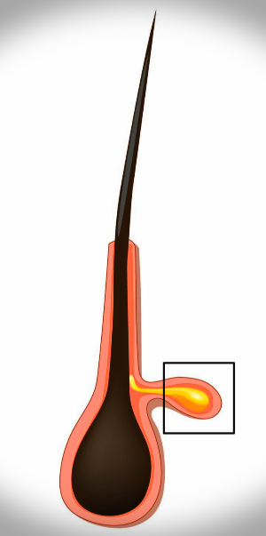 머리를 윤기 있게 보이게 하는 것은 모발의 해부학적인 구조 상 모낭과 붙어있는 피지선(sebaceous gland)에서 나오는 기름 때문입니다. 흔히 머리기름이라고 하죠. 적당하면 윤기 있는 머리카락이지만, 과다하게 나오면 소위 '떡'진 머리가 되고, 부족하면 푸석한 머리가 됩니다. 위 그림에서 표시된 부분이 모발 피지선입니다.