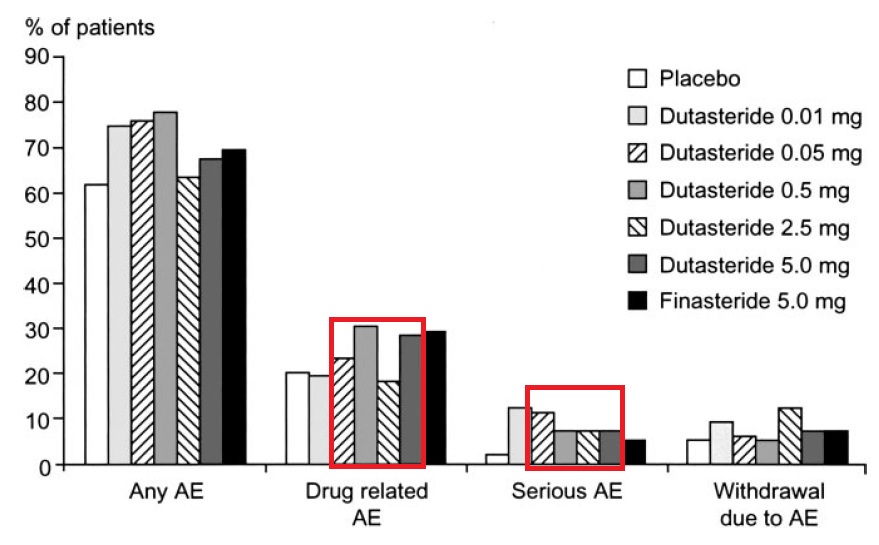 다른 연구에서는 용량과 직접적인 비례적 관계를 보이지 않는 결과를 보이기도 했습니다. 위 그래프의 왼쪽 붉은 박스 안을 보시면 0.5 mg 에서 부작용이 가장 많았고, 5.0 mg, 0.05 mg, 위약(placebo), 0.01 mg 순서입니다. 오른쪽 붉은 박스는 심한 부작용을 나타낸 것인데, 0.01 mg에서 가장 많았고, 0.05 mg가 그다음으로 많고, 0.5 mg, 2.5 mg, 5.0 mg 세 용량에서는 비슷한 결과가 나왔습니다. 부작용이 용량과 크게 관계없이 나온 것을 알 수 있습니다. 아보다트가 부작용이 용량과 관계없다고 하는 의견은 아마 이 연구를 보고 나온 이야기로 추정합니다.