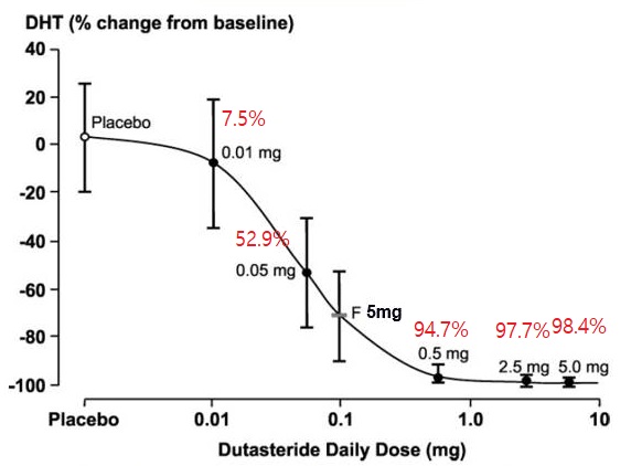 아보다트®로 대표되는 두타스테리드의 용량에 따른 혈중 DHT 억제율은 위 그래프와 같습니다. 시판되는 두타스테리드의 용량은 0.5 mg입니다. 0.01mg에서 7.5%, 0.05mg에서 52.9%, 0.5 mg에서 94.7%, 2.5 mg에서 97.7%, 5.0 mg에서 98.4%입니다. 0.5 mg이상부터 90%가 넘는 억제율을 보여주고, 0.5 mg와 5.0 mg은 10배 차이 농도인데 억제율 차이는 3% 정도밖에 나지 않습니다.