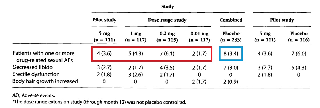 두타스테리드의 용량에 따른 성관련 부작용을 살펴보면, 성욕 감소 부분에서 0.05 mg 3%, 0.1 mg 3%, 0.5 mg 1%, 2.5 mg 13%를 보였습니다. 다른 용량에서는 1~3% 수준의 부작용 발생율이 2.5 mg 에서는 13%로 비약적으로 증가하였습니다. (위 표에서 붉은 박스해놓은 부분 참고하시면 되겠습니다.)