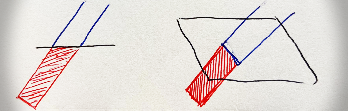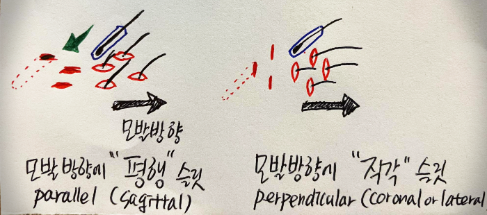 그리스의 의사 존토스(Dr. Zontos)는 위 그림처럼 설명하면서 평행 슬릿이 직각 슬릿에 비해 두피 상처 면적이 넓다고 주장했습니다. (출처: Sagittal Versus Coronal Incisions : How to Reduce the Injury to the Recipient Area by 300%. 2020 ISHRS) 그림을 보시면 빨갛게 표시된 부분이 피부에 모공을 만들 시 상처 면적인데 , 좌측의 평행 슬릿의 빨간 부분의 면적은 사다리꼴 모양으로 우측의 직각 슬릿의 직사각형 모양보다 넓습니다. 두피에 상처를 적게 주면서 이식할수록 회복이 빨라 결과가 더 좋아질 수 있다는 이야기입니다.