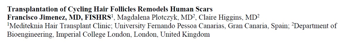의사 지메네즈(Dr. Franscisco Jimenez)는 실험을 통해 이런 흉터에 모발이식을 하고 흉터 조직검사를 해서 비교하였더니, 모발만 생긴 것이 아니라 흉터 자체의 톤도 개선이 된 것을 발견했습니다. 피부의 두께가 증가했고, 표피-진피 경계(epidermal-dermal junction)의 결속도 역시 증가하였습니다. 진피 내 세포의 증가와 혈관층이 탄탄해지는 것 역시 관찰되었습니다.