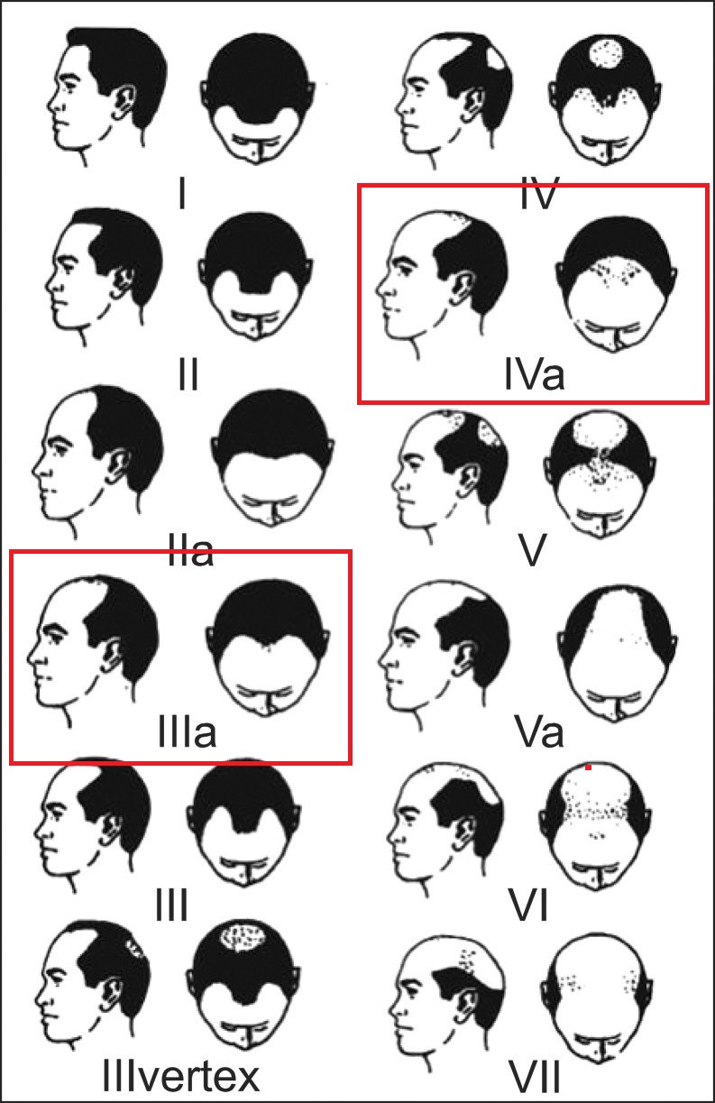 예를 들면 한 남성이 앞머리는 연모화가 있고, 윗머리와 정수리에는 연모화가 전혀 없는 경우, 치료를 전혀 하지 않는다고 가정 시 탈모의 최종 패턴은 노우드 3A 혹은 4A 정도를 예상할 수 있습니다. (아래 노우드 단계표 참조)