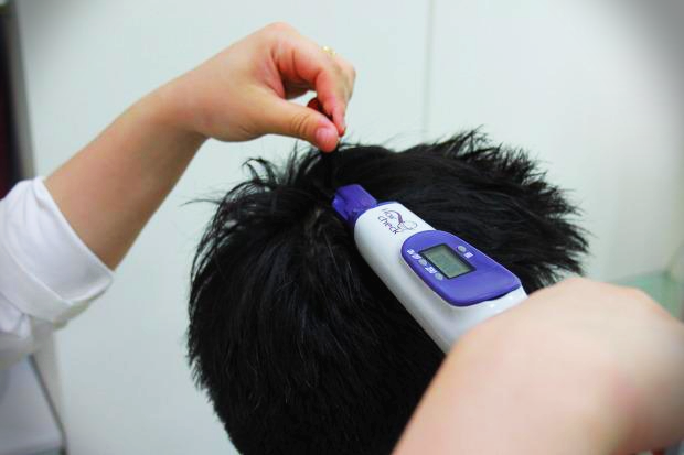 유전성 탈모가 흔하게 일어나는 앞머리, 정수리 부분 등 탈모가 일어난 것으로 의심되는 부분을 몇 군데 정하고 측정을 합니다. 그리고 탈모가 일어나지 않은 부분(유전성 탈모에서는 보통 뒷머리 부분)을 측정하여 탈모 부위와 아닌 부위를 비교합니다. 15~20% 이상 차이가 나면 탈모가 의심되며 그 차이가 클수록 탈모 정도가 심하다고 판단합니다.