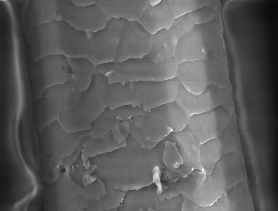 꾸준히 고데기를 사용해 관리한 모발의 전자현미경 사진입니다. 표면의 큐티클층이 매끄럽지 못하고 군데군데 물집이 잡힌 것처럼 볼록하게 튀어나온 부분들이 보입니다. 내부에는 강한 열 때문에 생긴 가스가 포함돼있습니다. 이런 모발을 버블 헤어(bubble hair)라고 합니다. 모발의 손상된 부분은 힘을 제대로 견디지 못하기 때문에 가벼운 자극에도 모발이 쉽게 부러지게 됩니다.