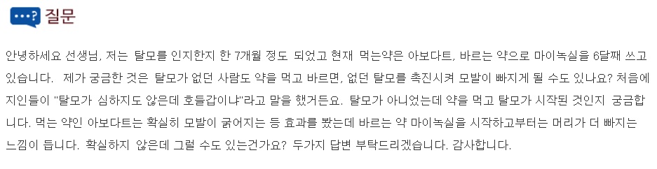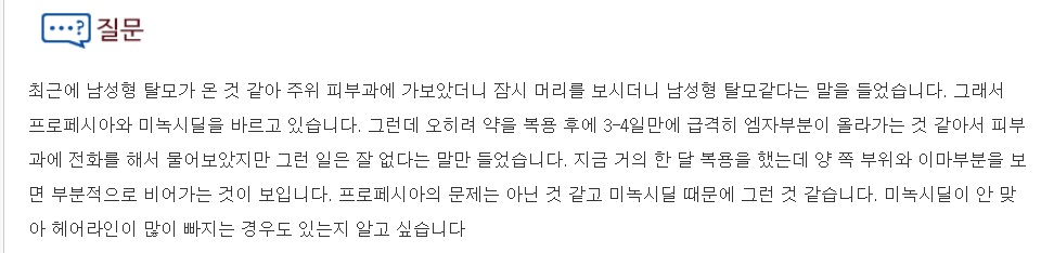 결론적으로 미녹시딜은 초기 3개월 정도 평소보다 탈모량이 더 늘어나는 쉐딩 현상이 있을 수 있는데, 이때 너무 걱정하지 말고 사용을 유지하시면 대부분 탈모량이 줄면서 탈모치료 효과를 보실 수 있습니다. 3개월 이상 지속되는 탈모는 의사에게 확인 받는 것을 권합니다.
