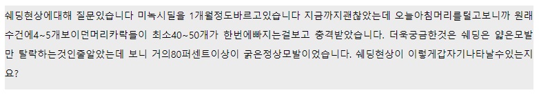 미녹시딜의 사용 결과를 보는데 최소 3개월 정도 걸리는데, 쉐딩 현상도 3개월 이상 지속되지는 않습니다. 만약 3개월 넘게 쉐딩이 있다면 이는 미녹시딜로 인한 증상은 아닐 가능성이 높습니다. 3개월 이상 지속된다면 의사에게 상태를 보여주고 확인하시기 바랍니다.