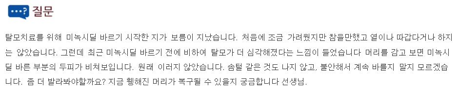 미녹시딜은 가장 많이 쓰는 탈모치료약 중 하나로 액체나 거품(폼) 형태로 나와 두피에 매일 도포하는 약입니다. 미녹시딜은 부작용이 심하지 않은 약으로 흔한 부작용으로는 가려움증이나 붉은 기, 각질, 모낭염, 다모증 등이 있습니다. 쉐딩(shedding) 현상이라고 알려진 부작용도 있는데 이는 미녹시딜을 바르고 탈모량이 오히려 평소보다 더 늘어난 증상입니다. 미녹시딜을 처음 쓸 때 생기고, 이럴 때 계속 써야 할지 중단해야 할지 고민이 많이 됩니다. 또 이런 고민을 하는 분들을 보며 겁이 나 시작을 못하겠다는 분들도 많습니다.