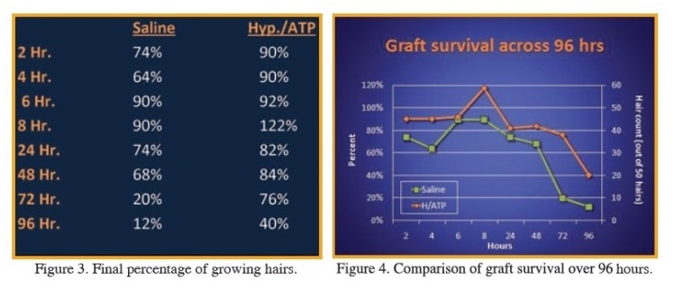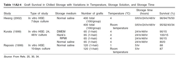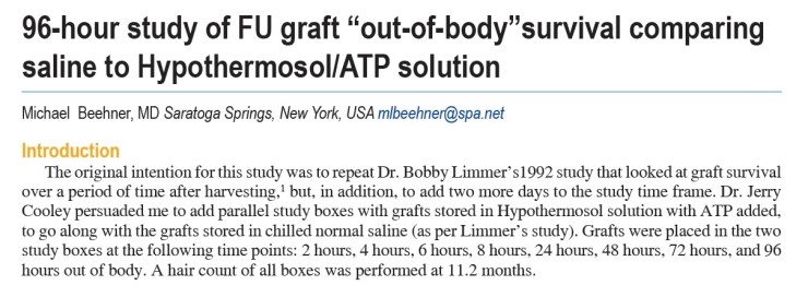 2011년 비너(Beehner)라는 뉴욕의 의사가 발표한 실험 논문에서 96시간 동안 2-24시간 간격으로 식염수와 장기저장액에 보관된 모낭을 이식하여 얼마나 이식된 모발 중에 생착이 일어났는지 비교하였습니다.