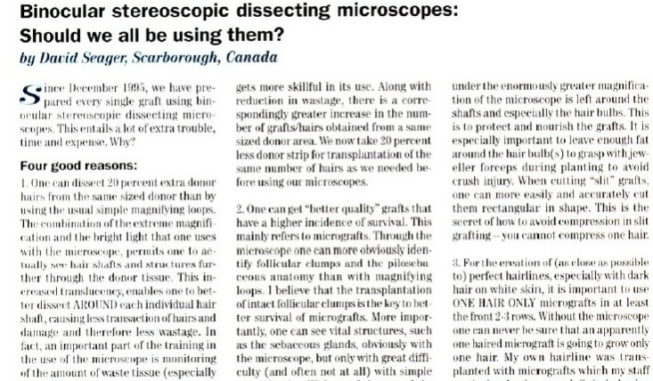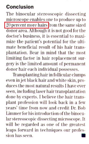 씨거(Seager)는 같은 두피 면적내에서 채취한 모발의 양이 현미경 사용 시 20%가 증가한다는 내용을, 번스타인(Bernstein)은 확대경(loupes)를 사용한 것에 비해 현미경 분리(microscopic dissection)이 17% 더 많은 모발을 획득하였다고 기술하고 있습니다.
