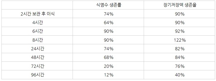 모든 시간대에서 장기저장액이 식염수보다 우월한 결과를 보이며, 특히 시간이 지날수록 생존율이 격차는 더욱 커집니다.