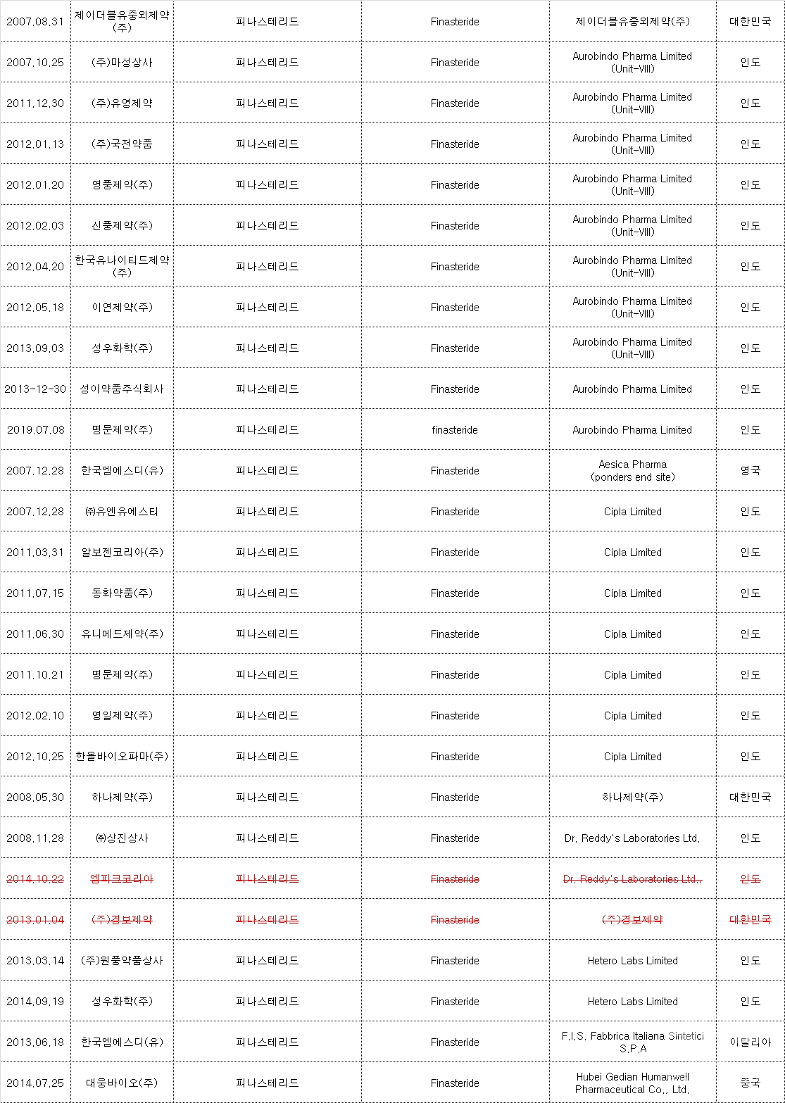 피나스테리드 원산지는 오리지널 약 프로페시아를 만드는 한국 엠에스디(MSD)가 이탈리아, 대웅바이오가 중국, 하나제약과 제이더블유 중외제약이 대한민국이었고, 나머지 약들은 인도였습니다.