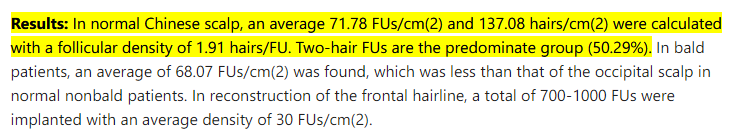 우선 자연적으로 타고나는 모발의 밀도를 살펴보겠습니다. 모발의 개수와 밀도는 인종에 따라 큰 차이를 보이는데 관련 연구에 따르면 동양인의 경우 두피 1제곱센티미터(cm2)에 평균 71.78 개의 모낭단위가 존재하고 모수는 평균 137개 정도 됩니다. 모낭 단위마다 평균 1.91개의 모발이 관찰되며 모낭 단위 가운데 약 절반 정도가 2모를 갖고 있습니다. (출처: The distribution of follicular units in the Chinese scalp: implications for reconstruction of natural-appearing hairlines in Orientals)