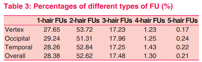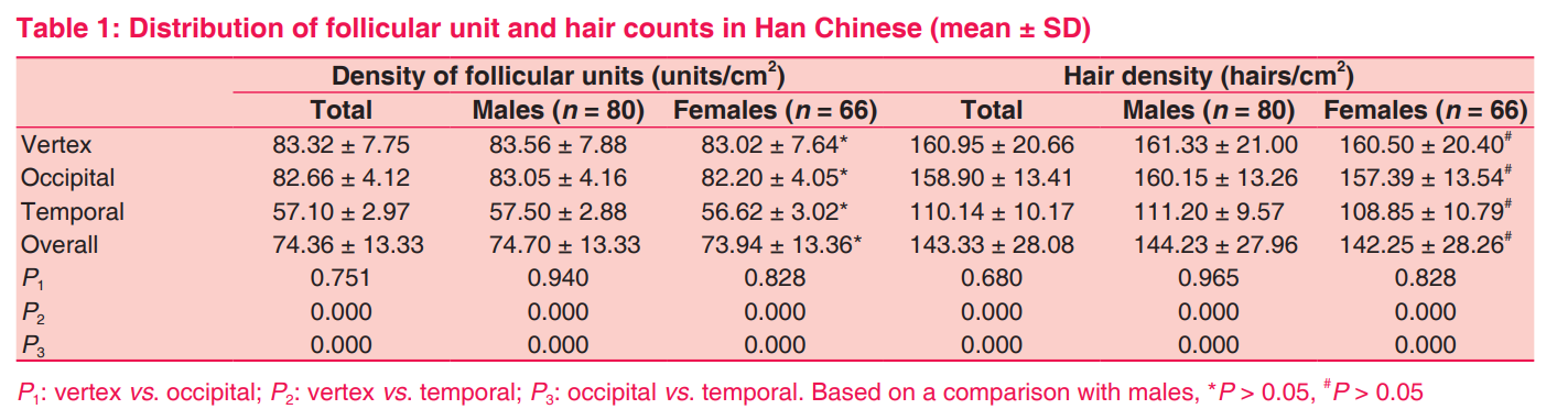중국 한족의 평균 모발 밀도와 모낭 밀도를 측정한 연구입니다. 후두부와 정수리 부위는 1cm^2 영역에 평균 83개 내외의 모낭, 160개 내외의 모발이 존재하지만 측두부는 평균 57개의 모낭 정도로 확연히 적습니다. 헤어라인 가장 앞쪽 부위의 밀도는 측두부와 유사하고 전두부는 그 중간 정도로 알려져있습니다.