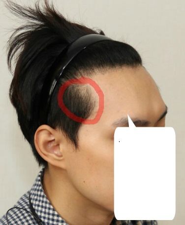 빨간 동그라미 친 부분이 전진시킨 측면 헤어라인 부분입니다. 관자놀이 부분과 구레나룻 부분에 모발이식을 시행하였스니다.