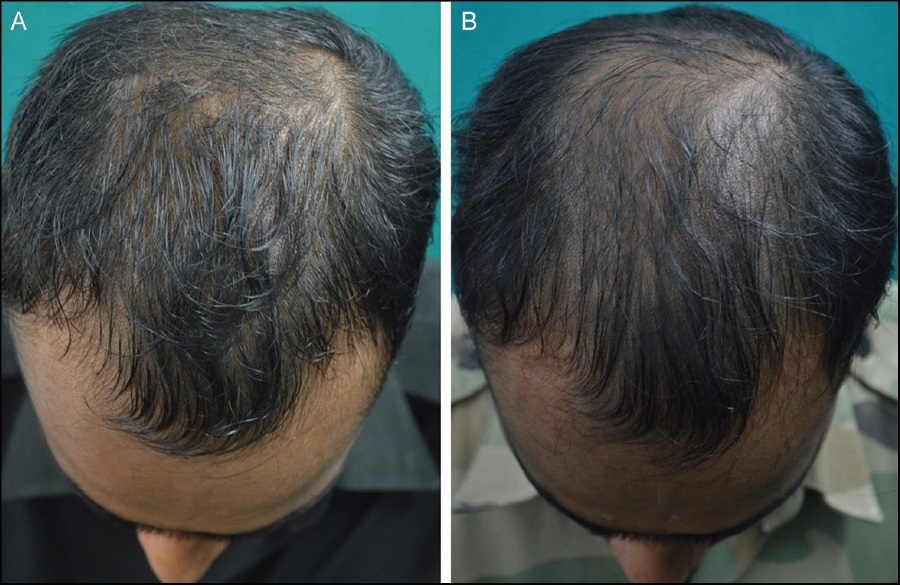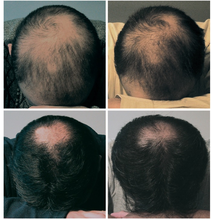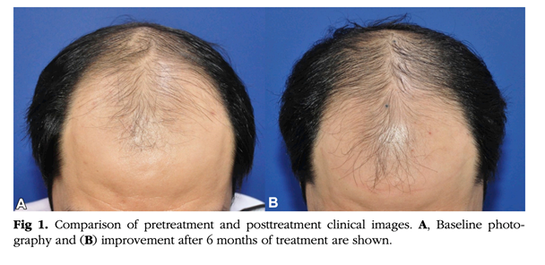 6개월 후 결과는 11명(45%)에서 10% 이상의 모발 증가를 보였으며, 8명(33%)은 약간 증가, 5명(20%)은 효과가 없었습니다. 피지 분비는 19명에서 다시 원래 상태로 돌아왔습니다. 아래 사진은 실험자 중 한 사례입니다.