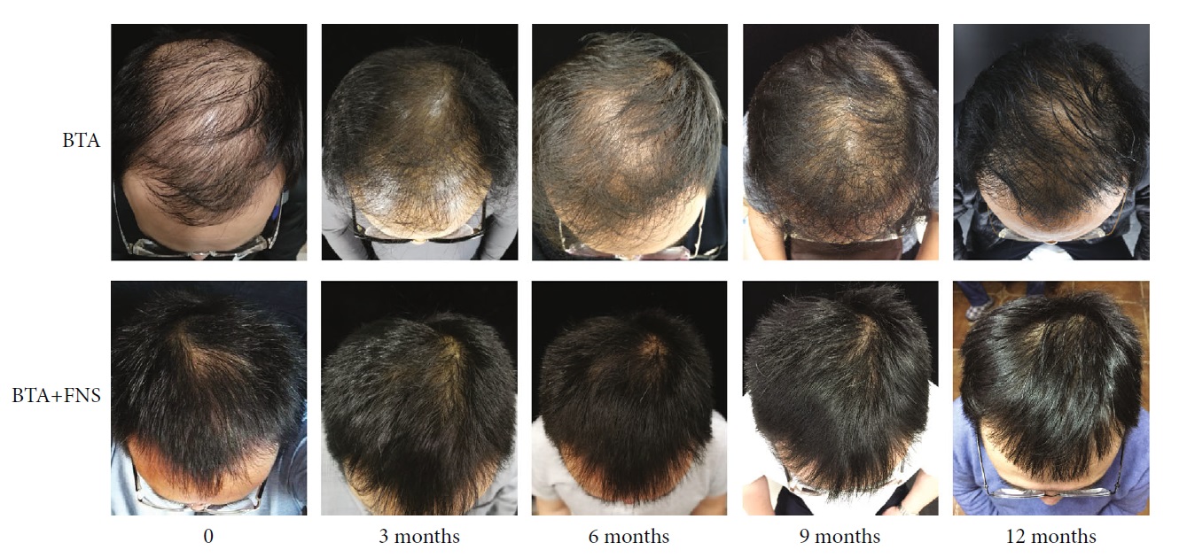두번째 논문(2018년)은 10명의 남성 탈모인에서 각 환자 두피마다 30군데 5 유니트씩 총 150 유니트를 주사하였으며, 6개월 뒤 평가에서 8명(80%)의 환자에서 개선을 보였고, 7명(70%)의 환자가 스스로 상태가 좋아진 것을 느꼈습니다. 아래 사진이 논문에 실린 치료 6개월 전후 사진입니다.
