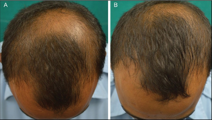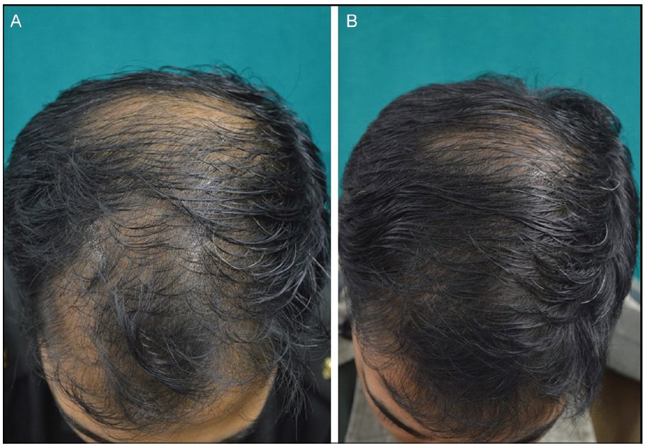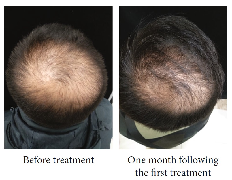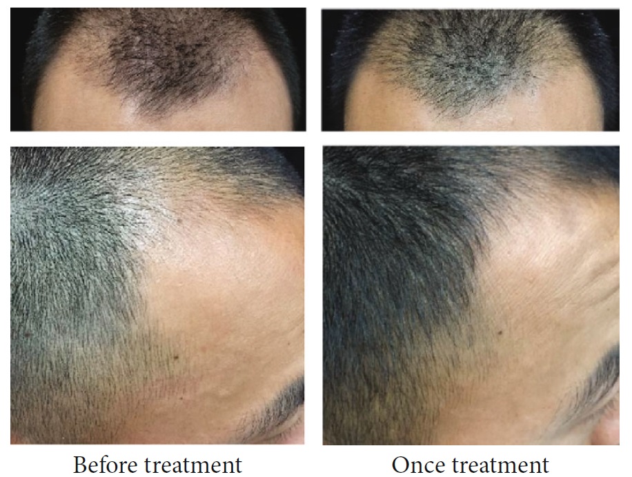 2020년 12월 단국대학교 피부과 박병철 교수님이 발표하신 연구에서는, 18명의 남성을 대상으로 실험할 결과 12주(3개월)까지는 큰 차이가 없었으나 24주(6개월)가 지나서 효과가 나타났습니다. 1 제곱센티미터당 평균 7개 정도의 모발이 증가하는 결과가 나왔습니다. 아래가 케이스 중 한 분입니다.