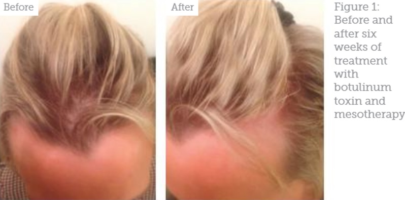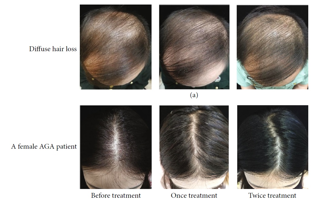 두번째 연구(2016년)는 15명의 여성 탈모, 5명의 남성 탈모 증상이 있는 사람을 대상으로 기존의 모낭주사 성분 등에 보톡스를 섞어서 치료를 하였는데 모든 환자에서 만족할만한 결과가 나왔다고 발표하였습니다. 아래가 시술 후 사진들입니다.
