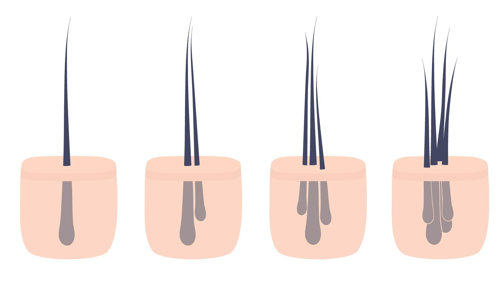 모발을 생산하는 모낭(뿌리)의 성질에 따라 모발(줄기)을 1개만 만들기도 하고 2~4개를 만들기도 합니다. 두피 바깥에서 보면 모공에서 모발이 한 개 나오는 것도 있고 2~3개 나오는 것도 있죠. 아래 사진을 보시면 잘 아실 수 있을 것입니다.